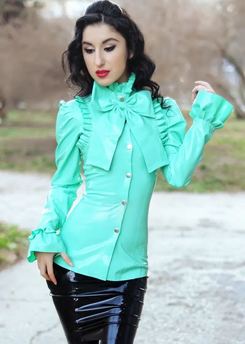 – Tight-fitting contoured hip-length shirt with front stud buttons as shown;
