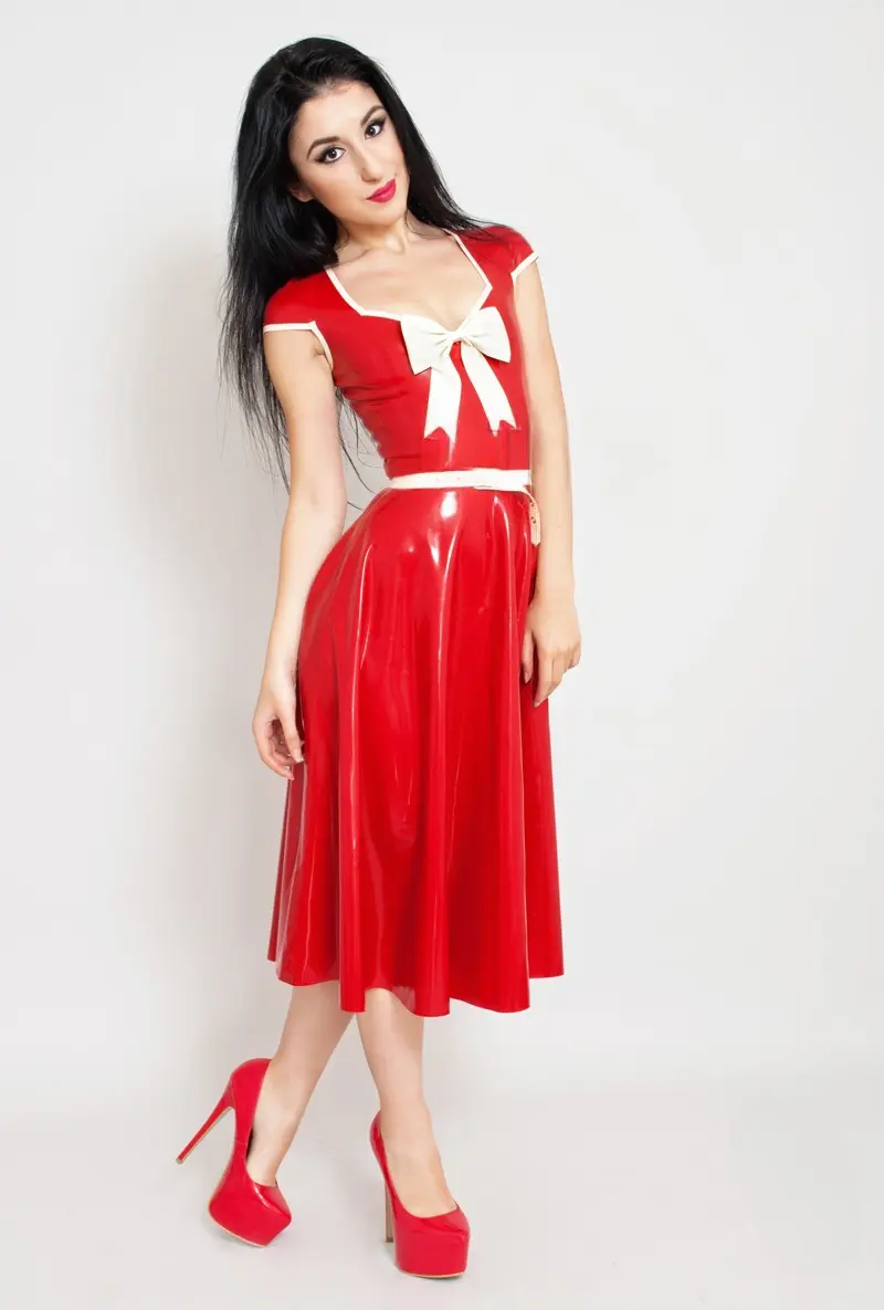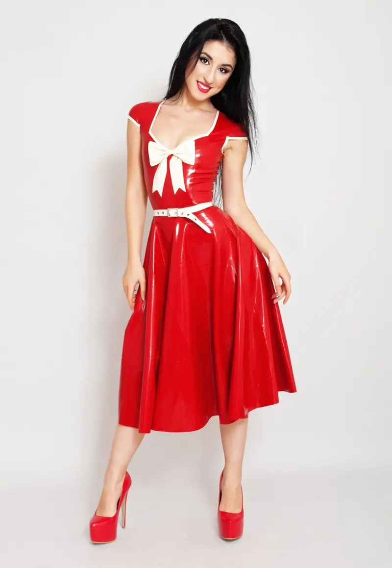 – Mid-calf length latex party dress in solid color with contrast color trim as shown;