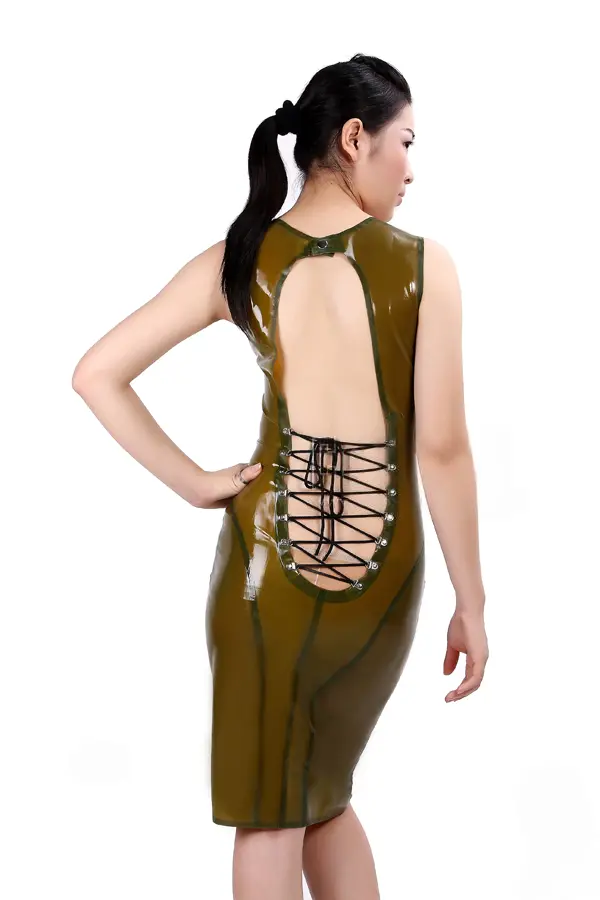 – Transparent latex knee-length dress with curved hemline and neckline as shown;