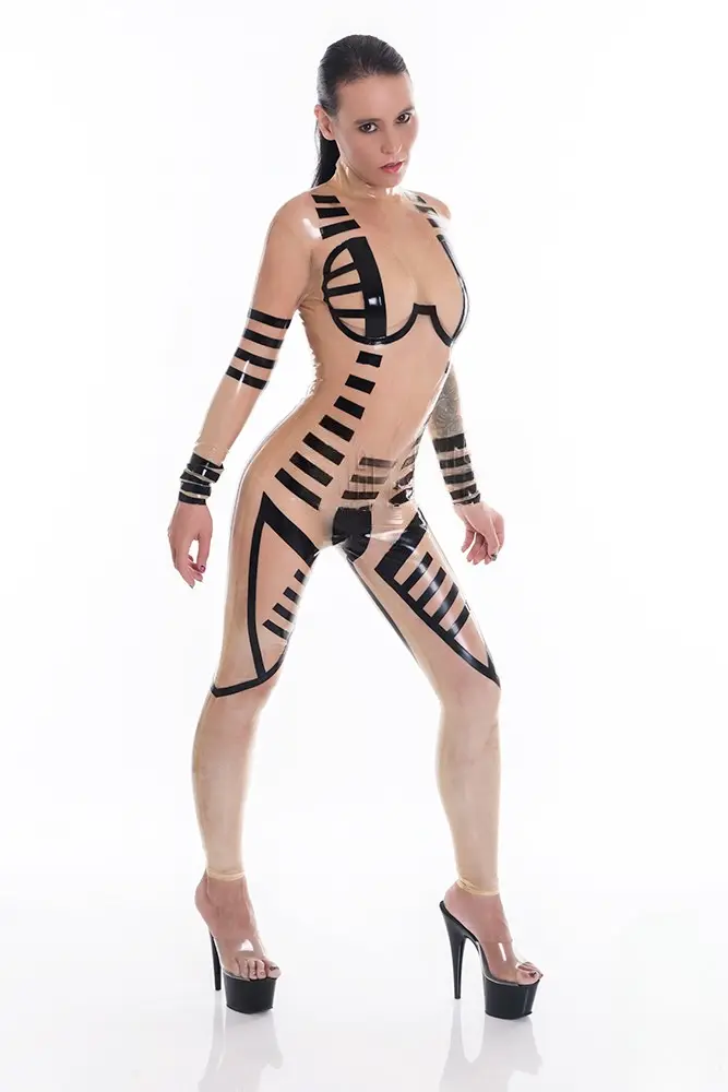 – Tight-fitting catsuit in semi-transparent latex with contrast color detailing as shown;