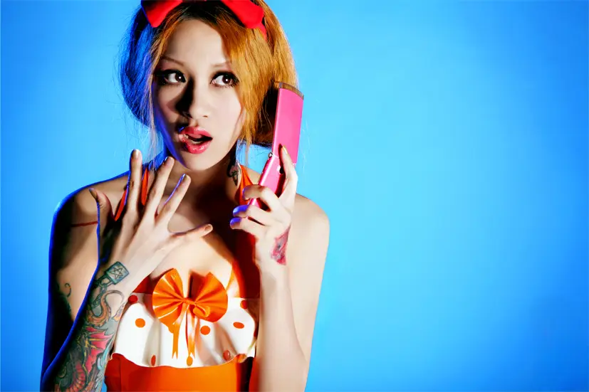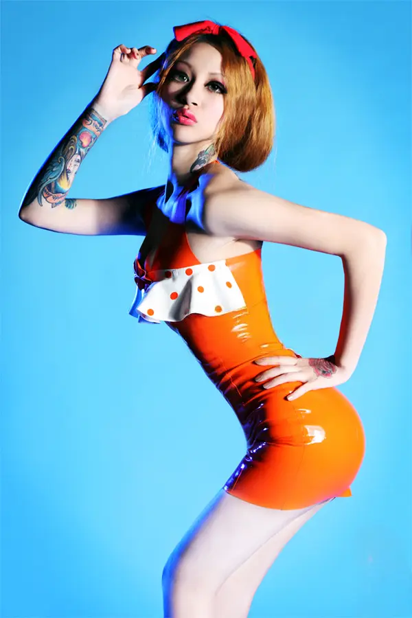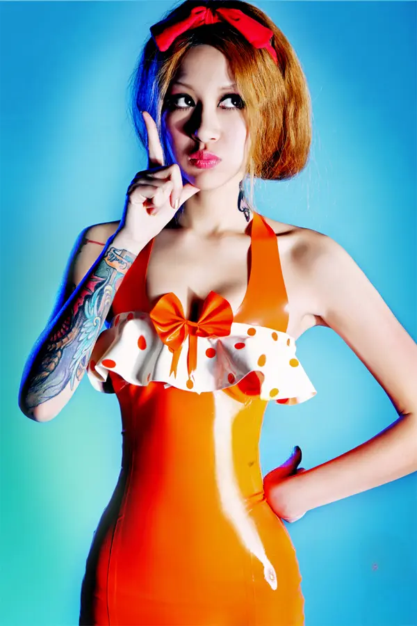 – Contrast color polka-dot flared frill across front neckline as shown;
