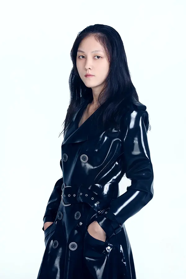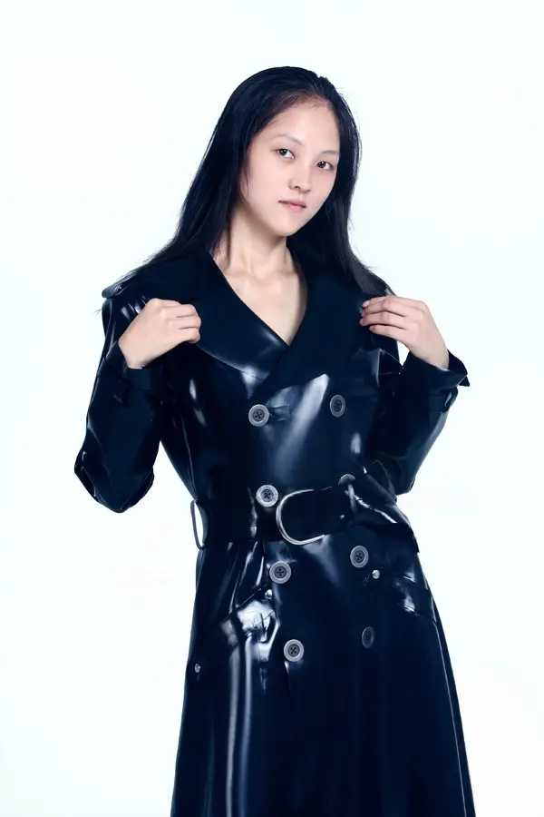 – Ankle-length double-breasted coat with large buttons and wide collar as shown;
