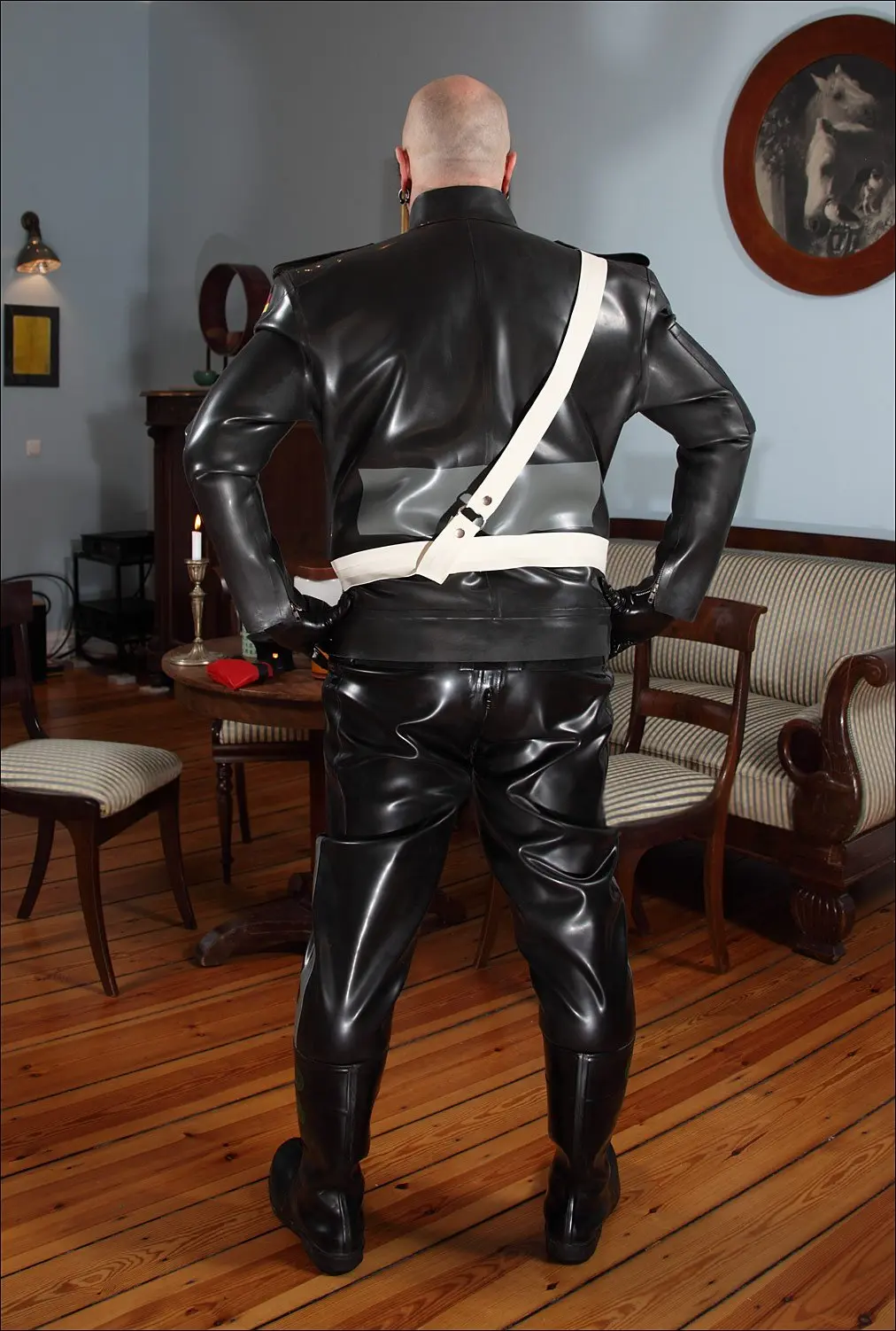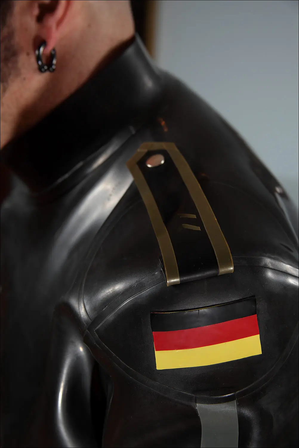 This is a replica of the famous German biked MP Uniform called Feldj?ger. The latex version is replicating the grey and black style of the original uniform and is also fitted with a connection zipper and latex pads to simulate the protector pads of the original uniform.