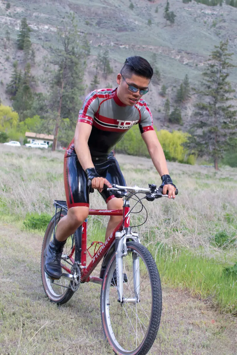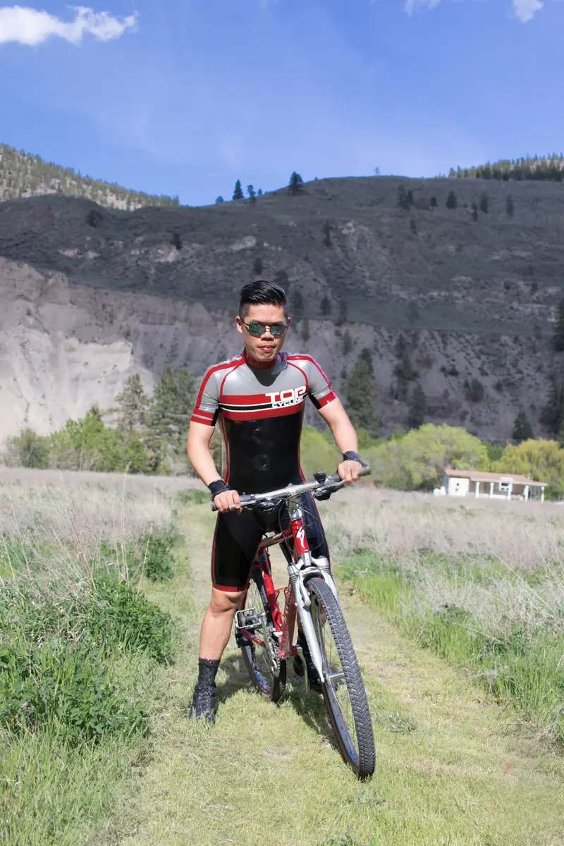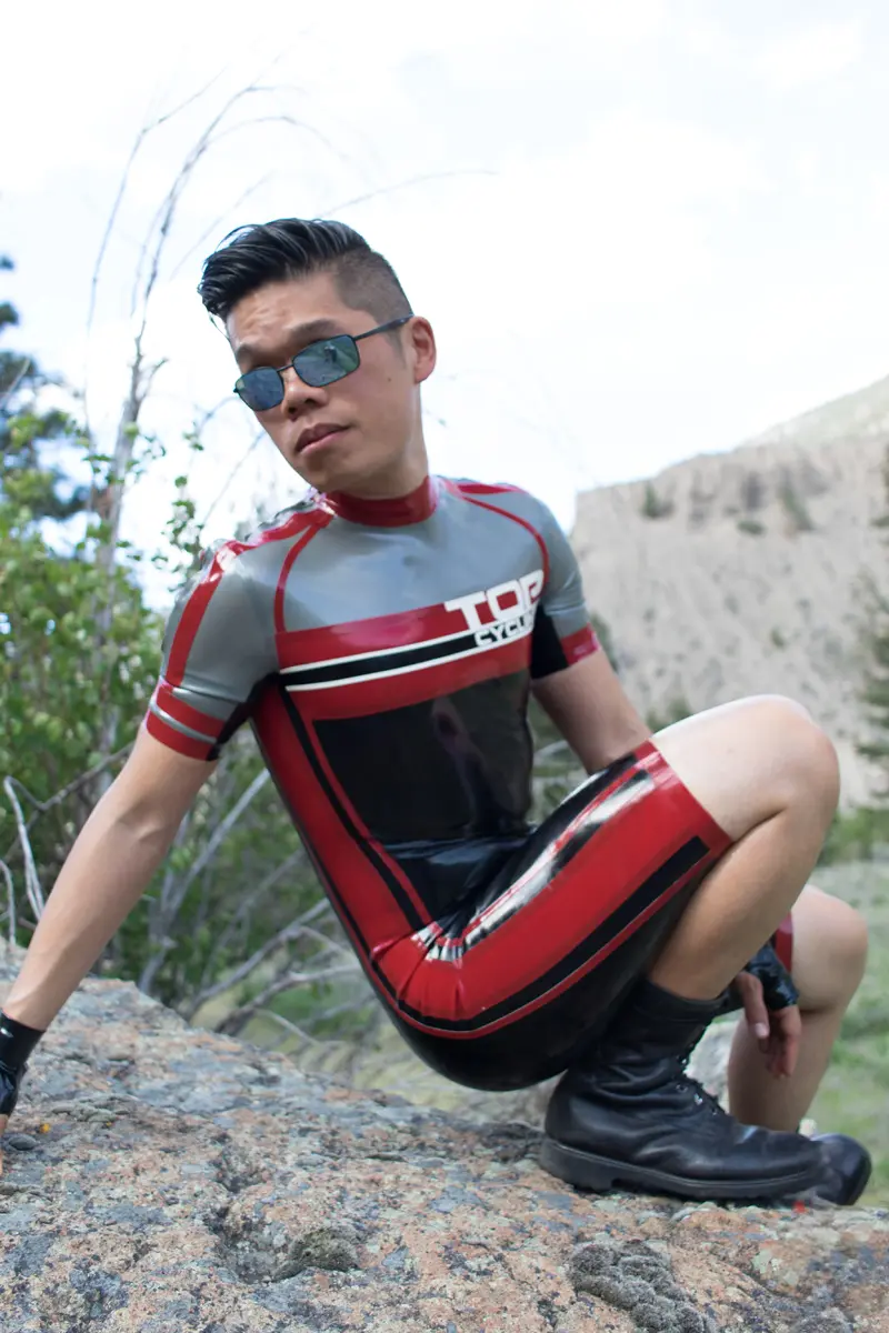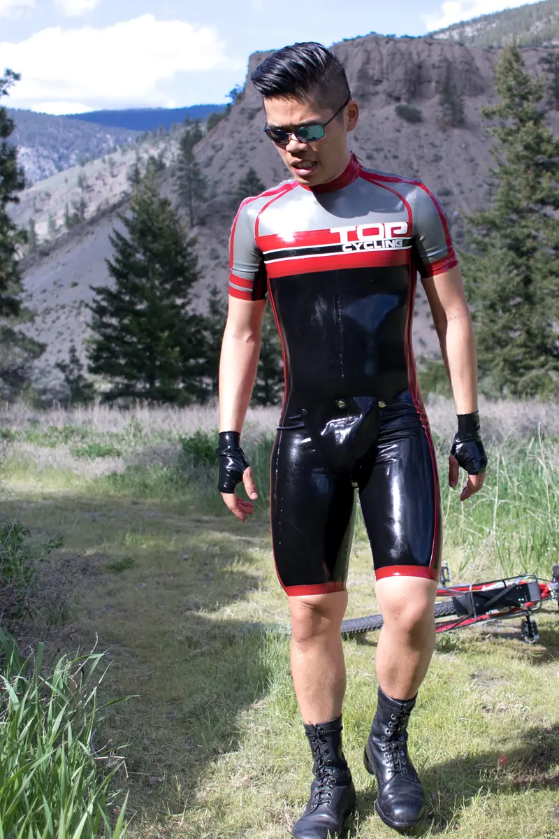 – Cycling style suit designed to resemble brand name competition cycling suit in four colors as shown;