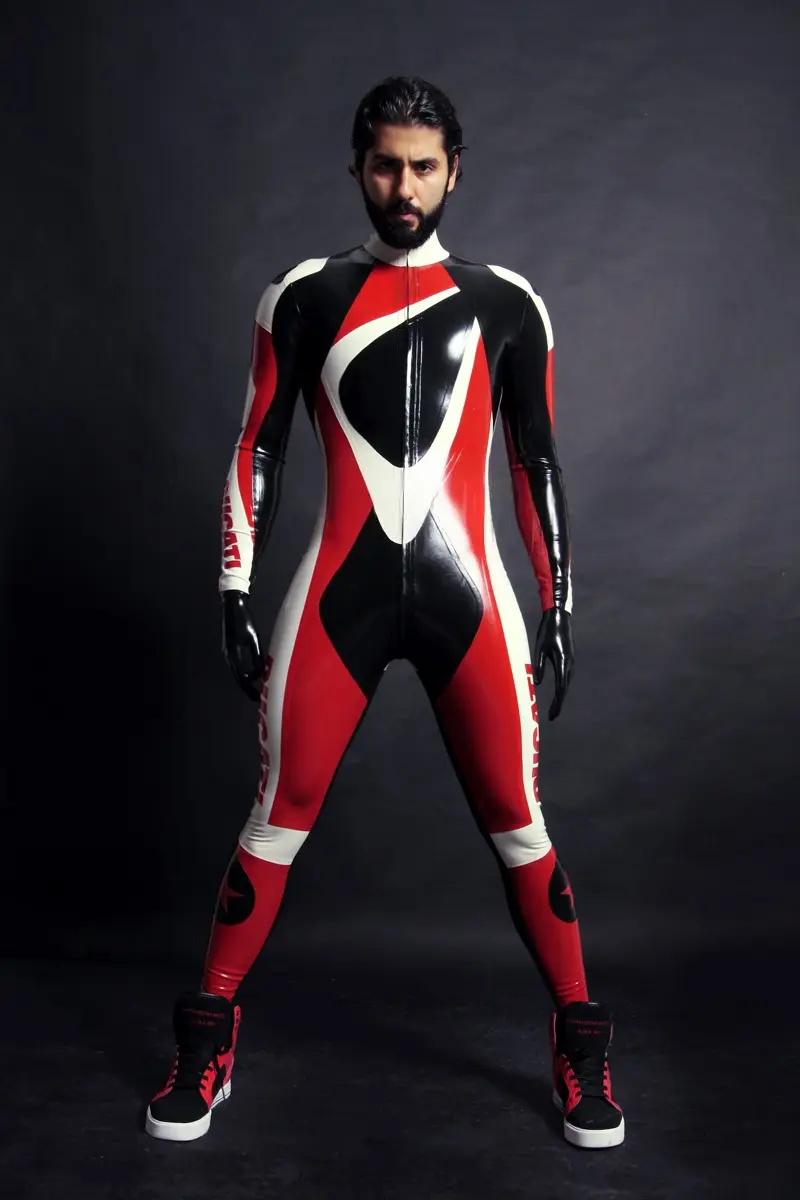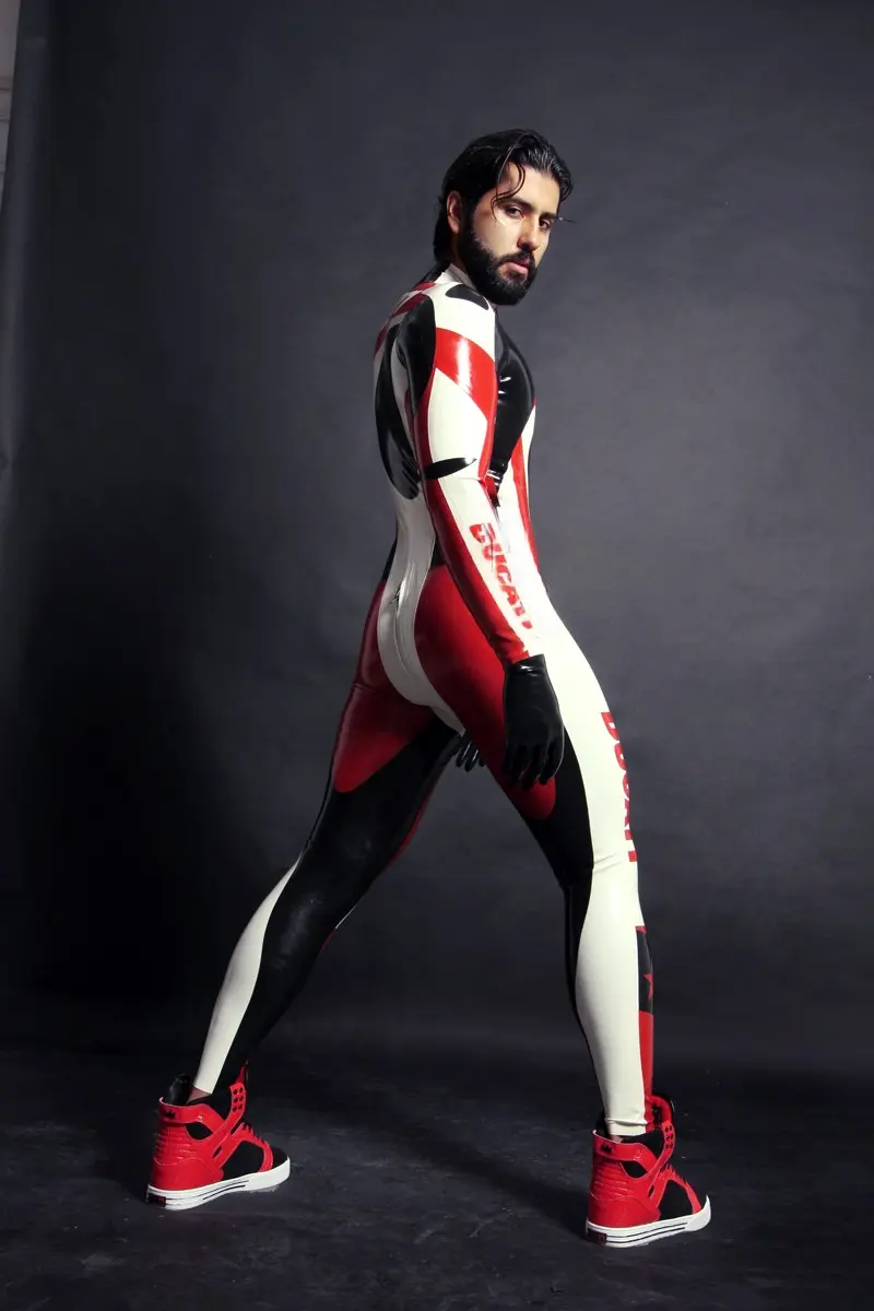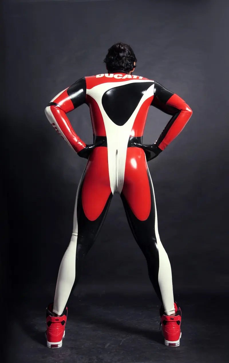 – Latex full catsuit in similar design to brand name motoGP biker leathers in three colors;