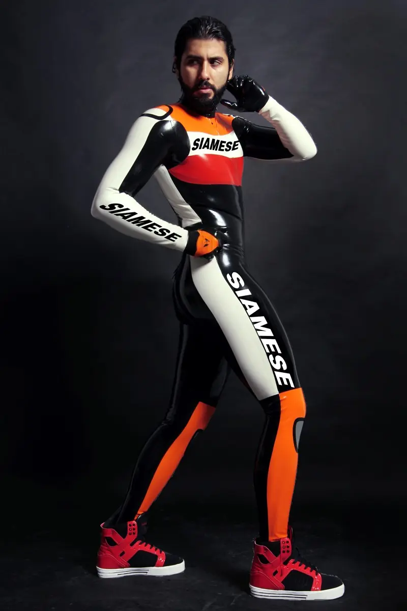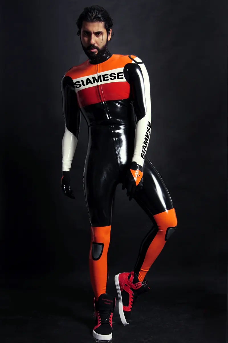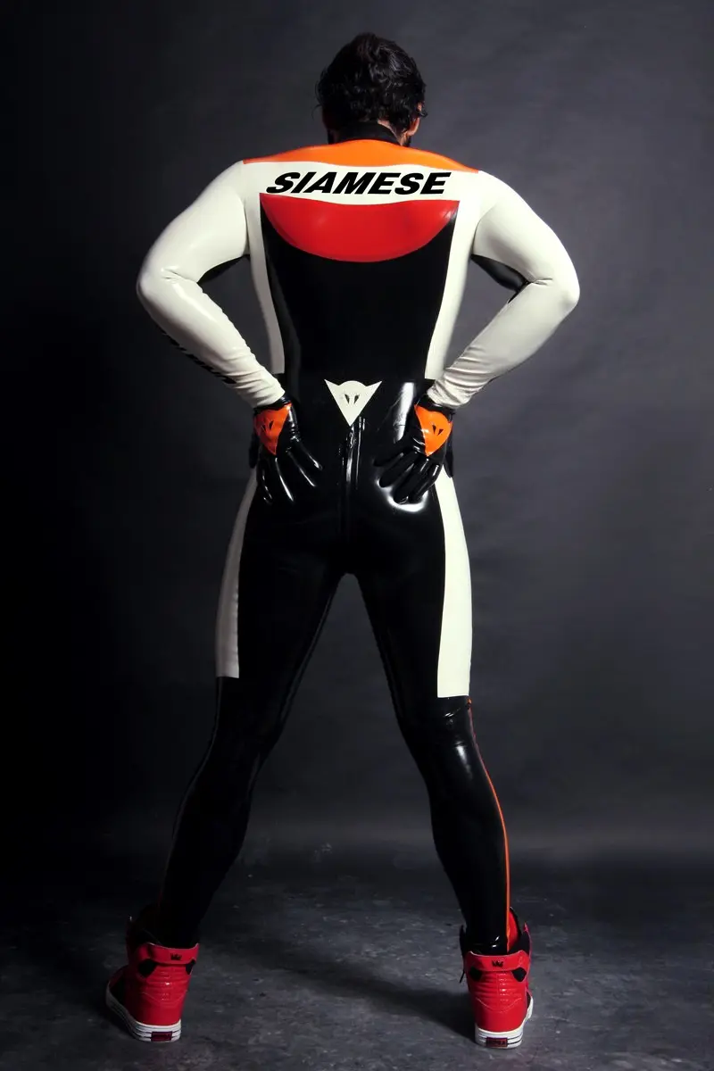 – Latex standard catsuit modelled on a brand name motoGP biker leathers in four colors;