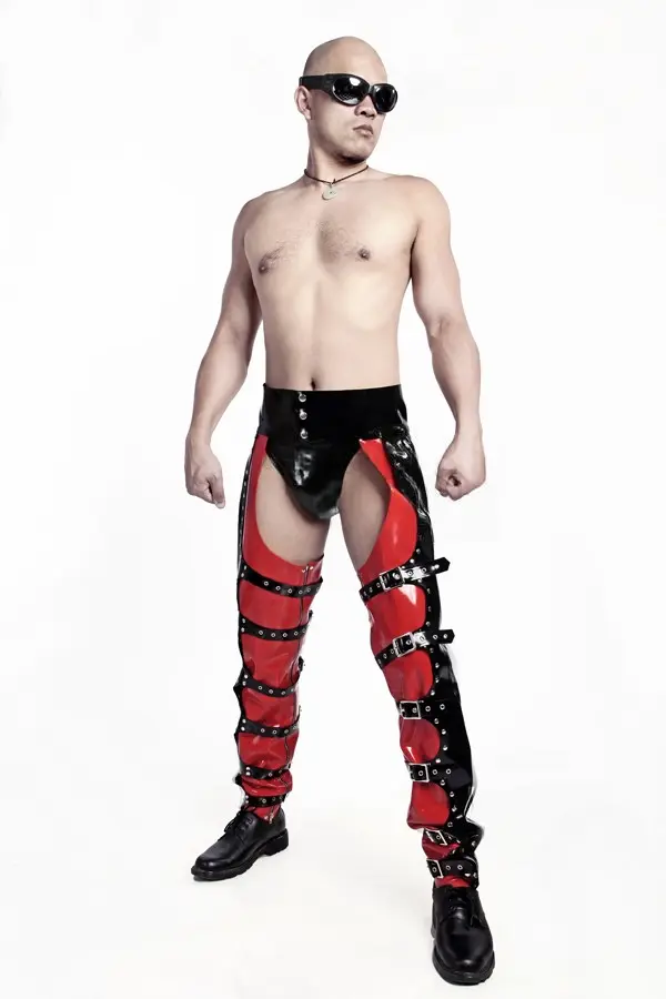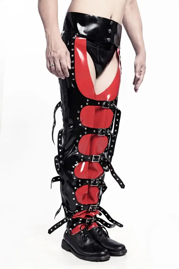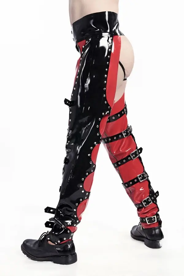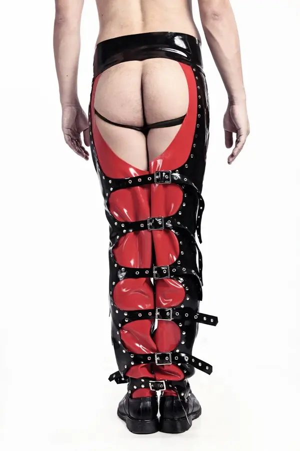 – Heavy grade latex chaps with six buckled adjustable straps down the legs;