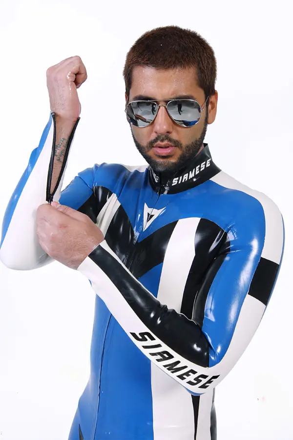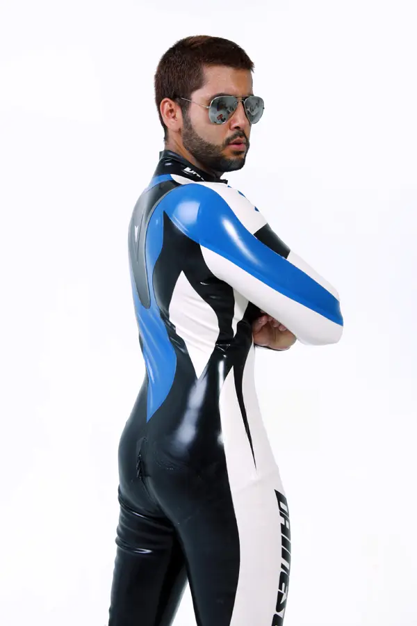 – Catsuit designed to resemble brand name motoGP biker leathers in three colors as shown;