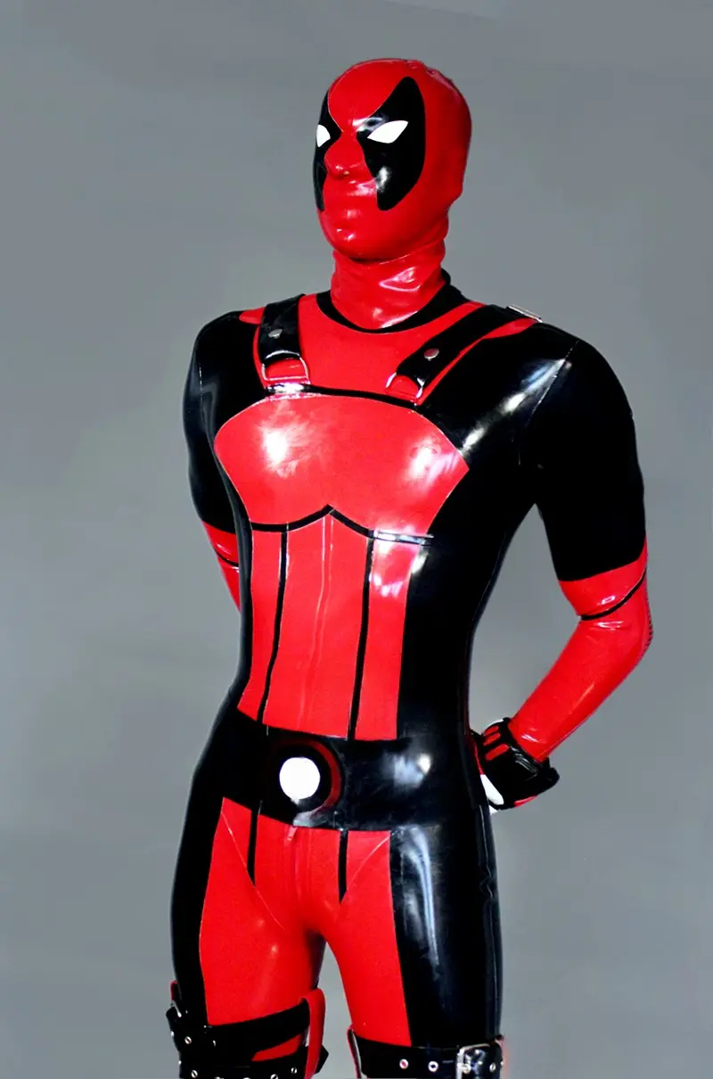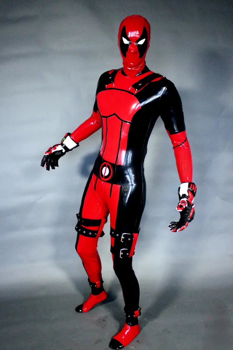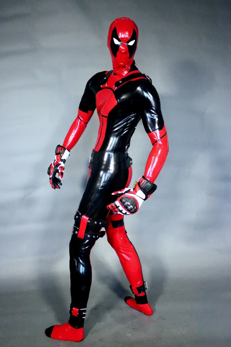 – Latex catsuit modelled on the ‘Deadpool’ super hero character in two colors;