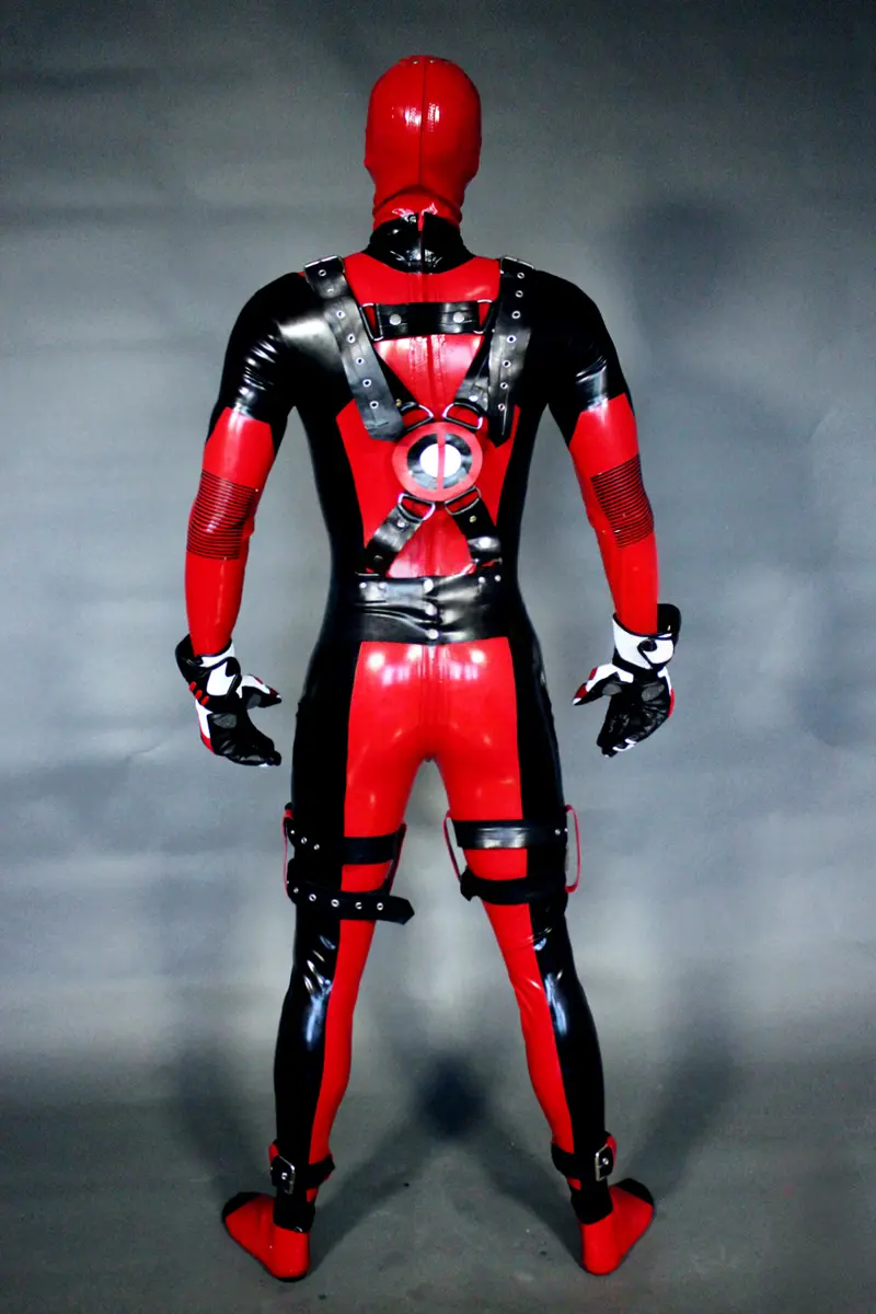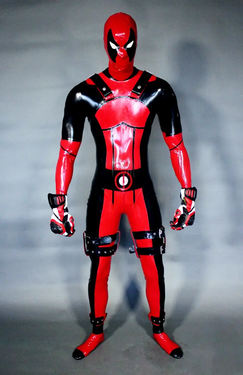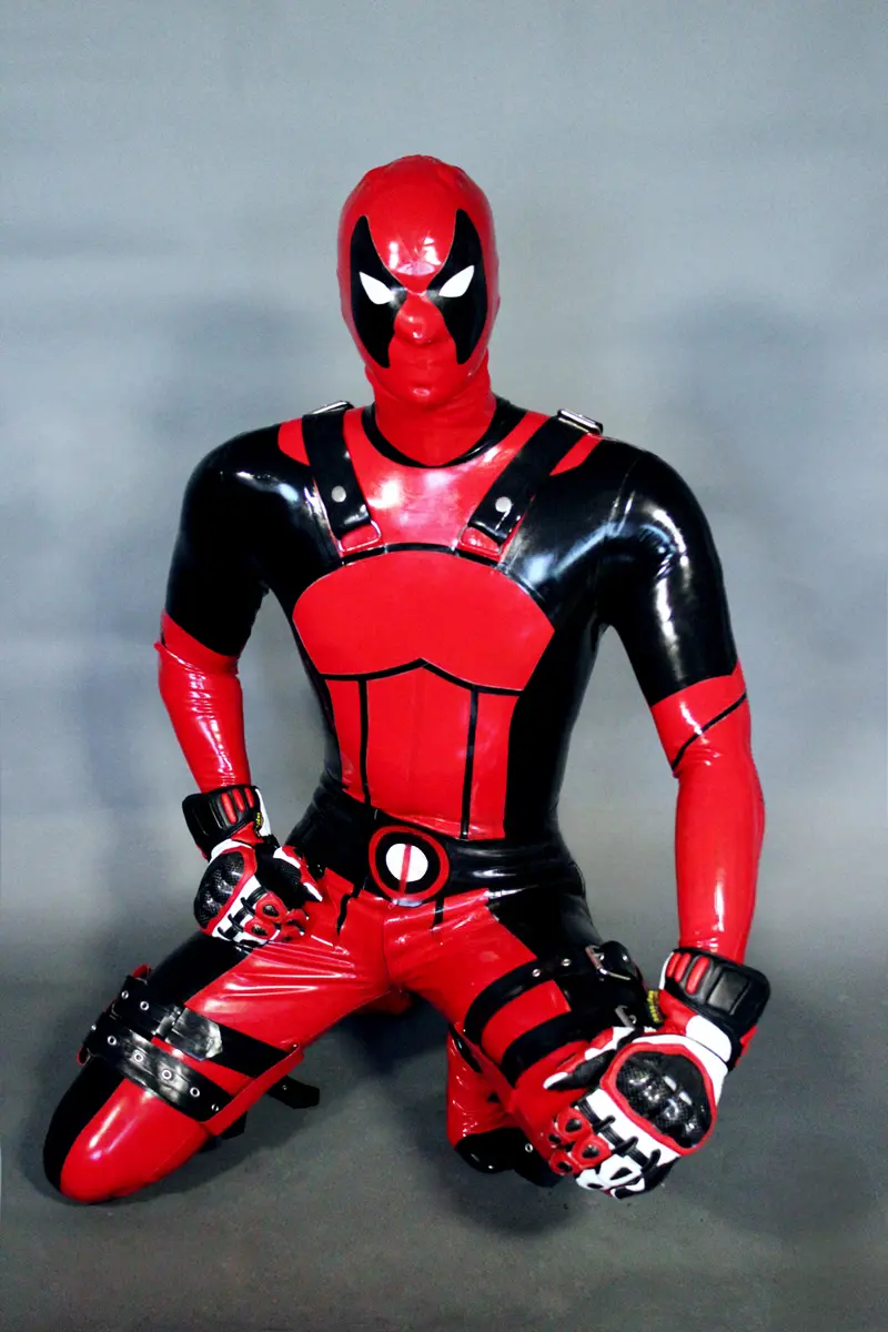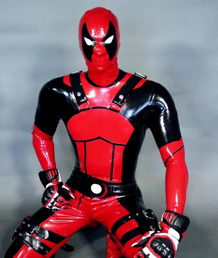 – Latex catsuit modelled on the ‘Deadpool’ super hero character in two colors;