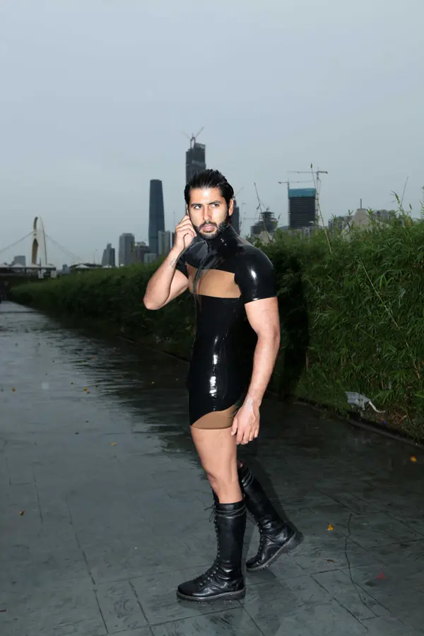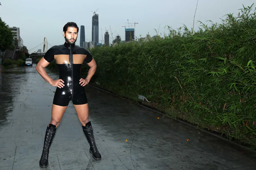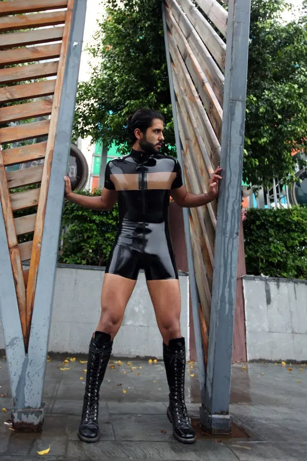 – Transparent contrast color latex panel from the back shoulders in curved shape down to the bottom of the legs;