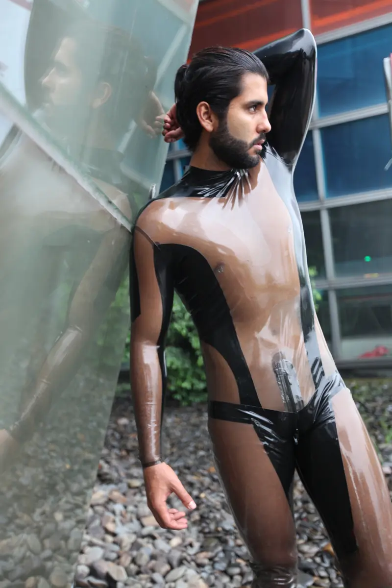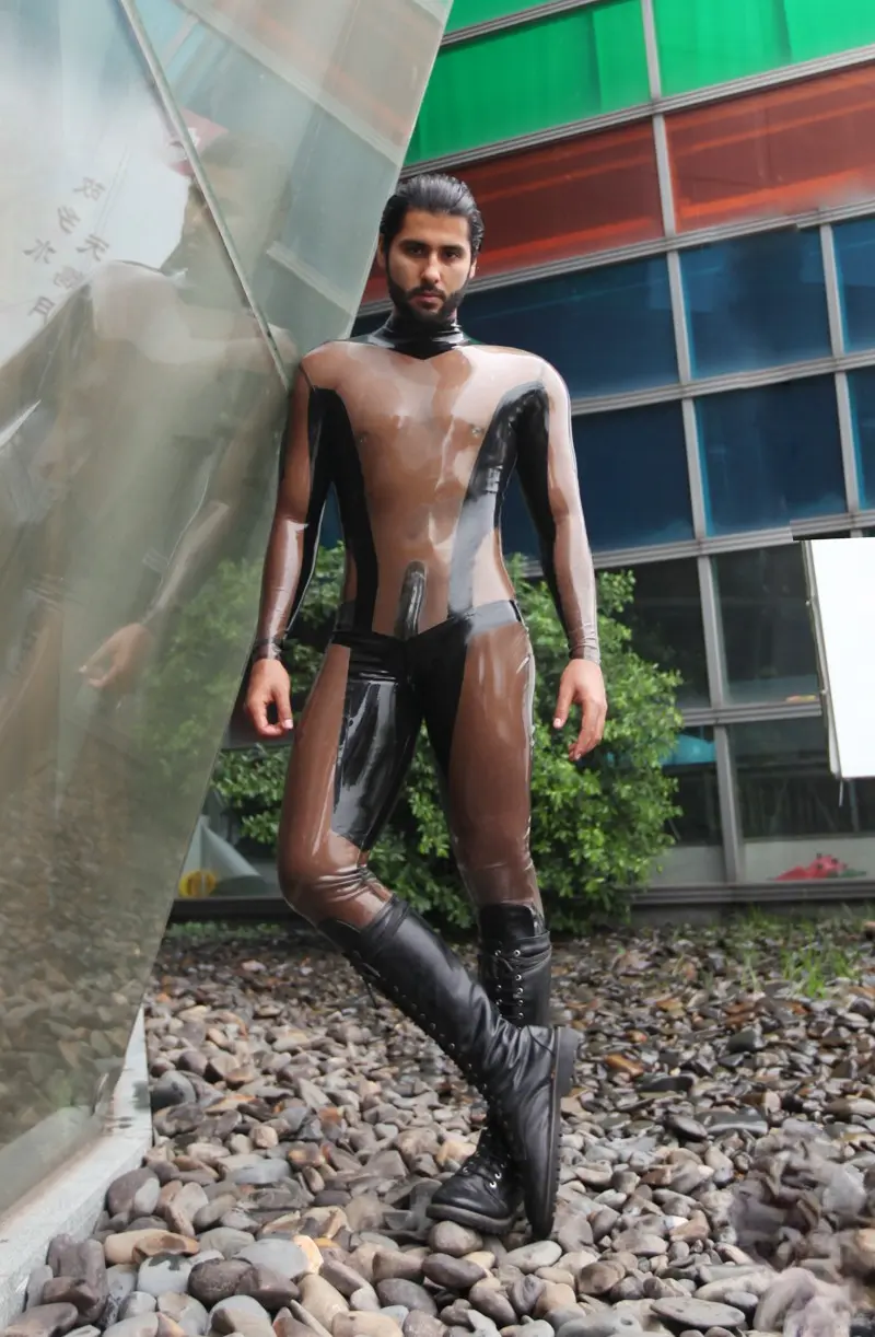 – Transparent latex as main fabric, with contrast color panels in crotch and inner thighs;