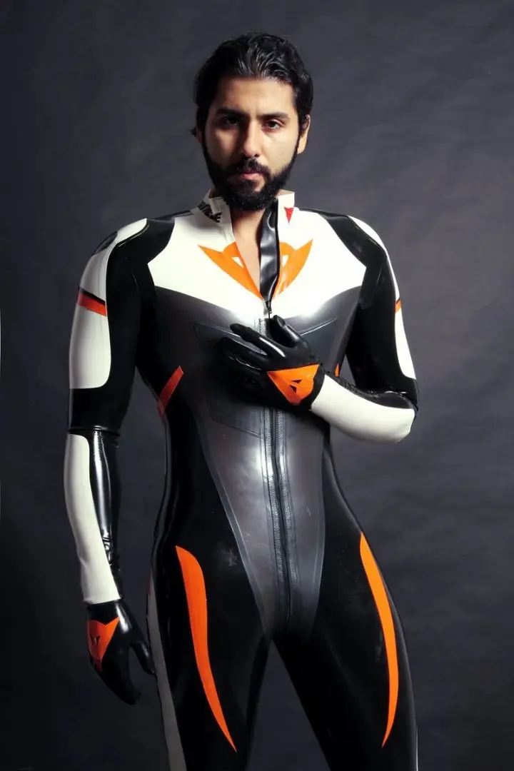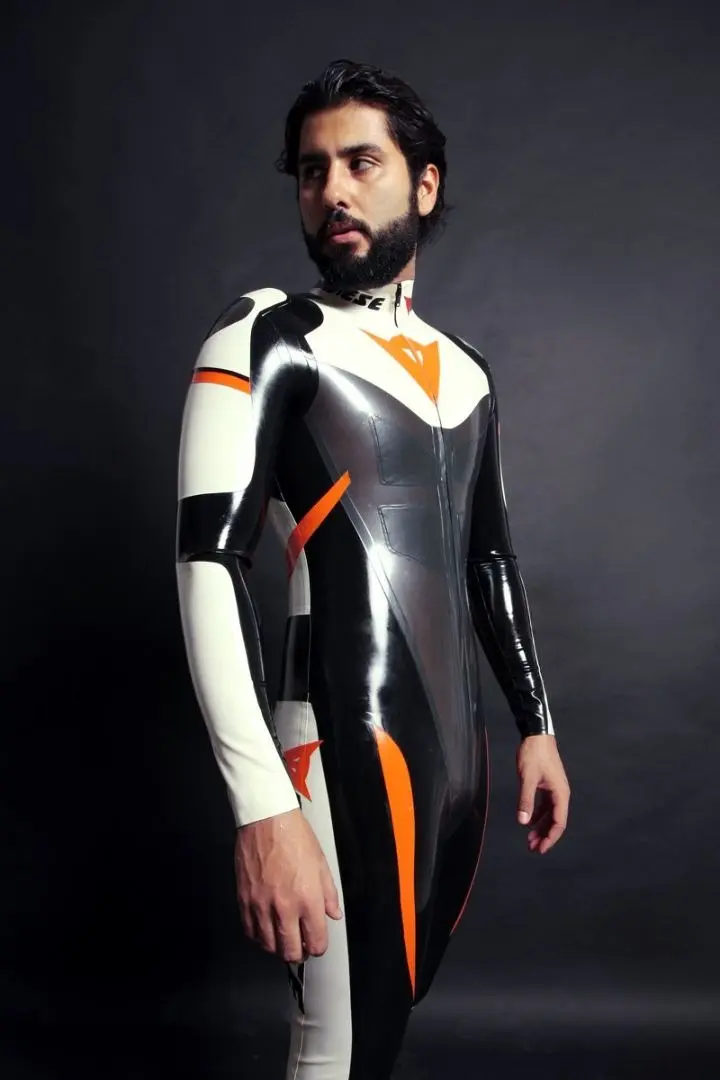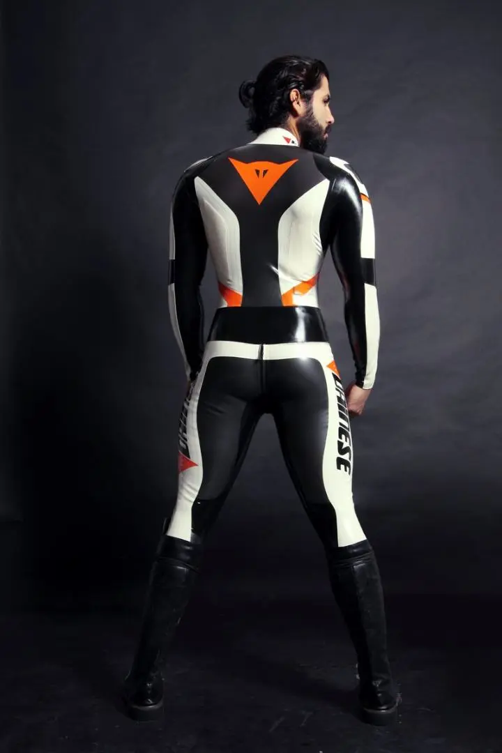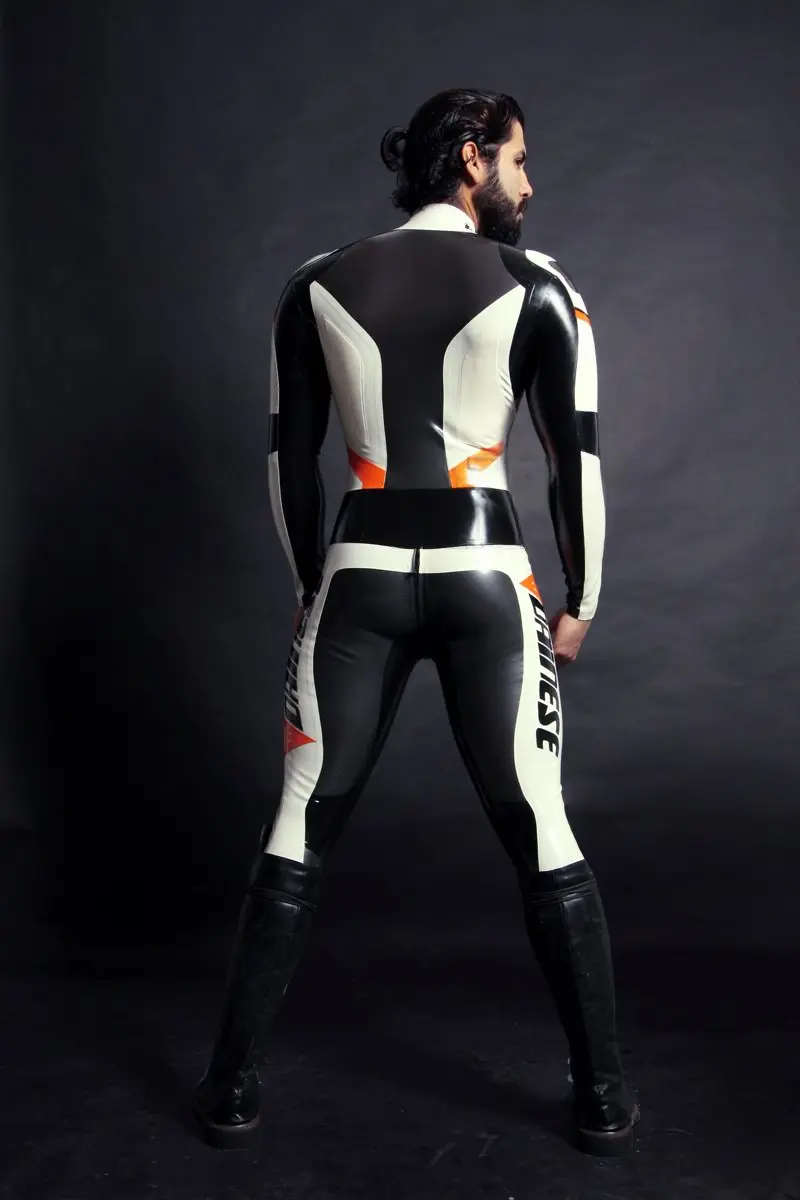 – Latex catsuit in multiple colors with design based on motoGP biker leathers;