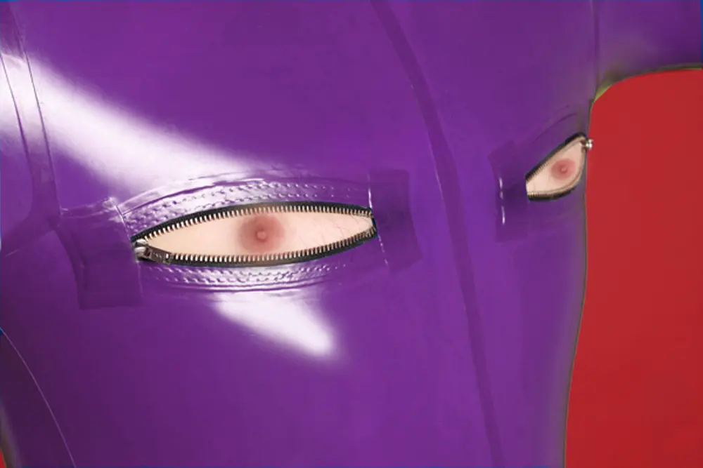 – Two short horizontal one-way zippers on chest for nipple access as shown;
