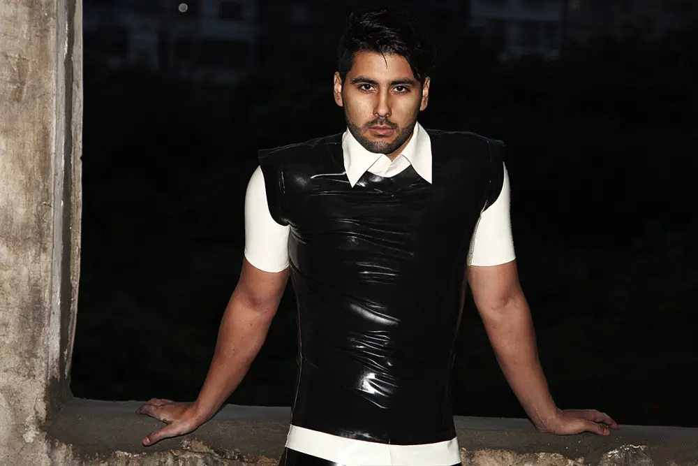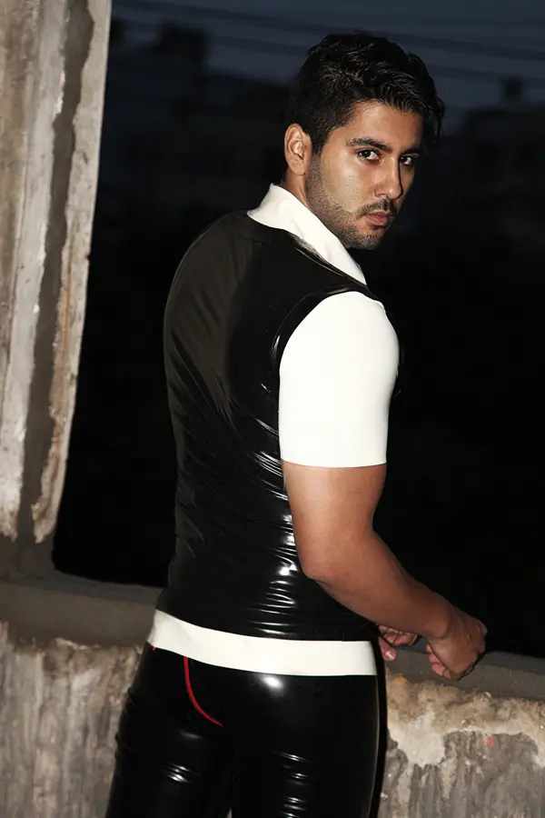 – Tapered shape top in jerkin style with contrast color sleeves and collar as shown;