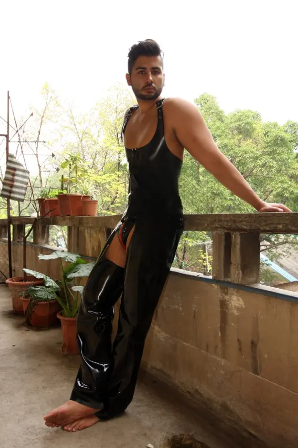 – Loose-fitting chaps style suit with attached upper singlet as shown;