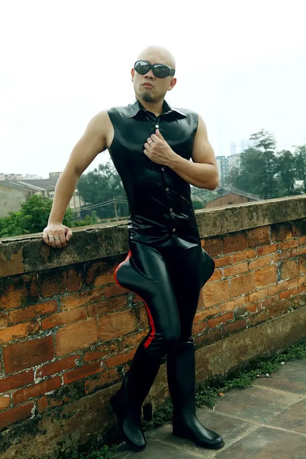 – Latex slim-cut sleeveless shirt with wide lapel collar as shown;