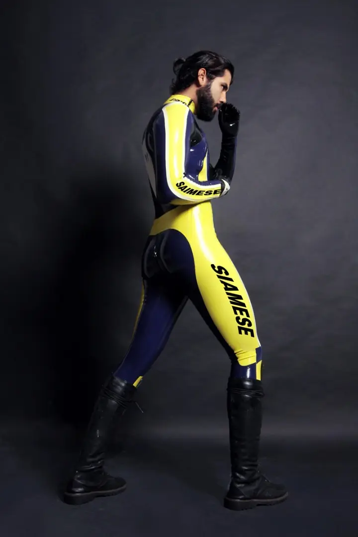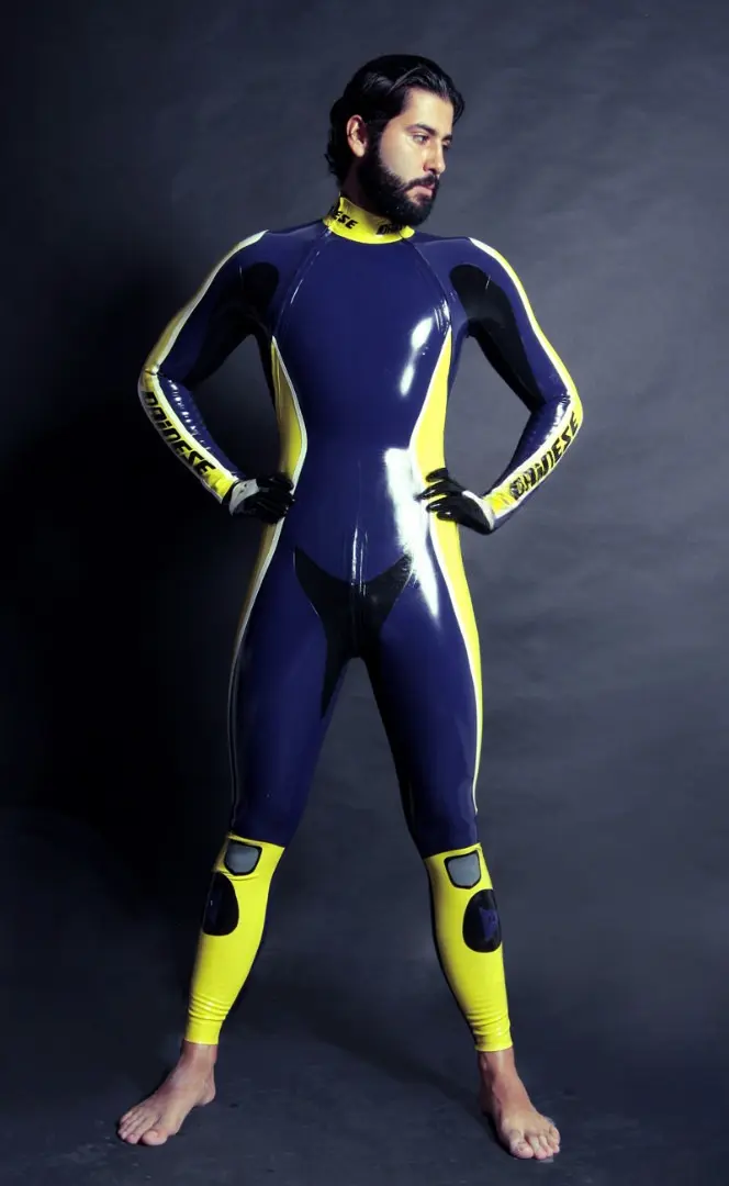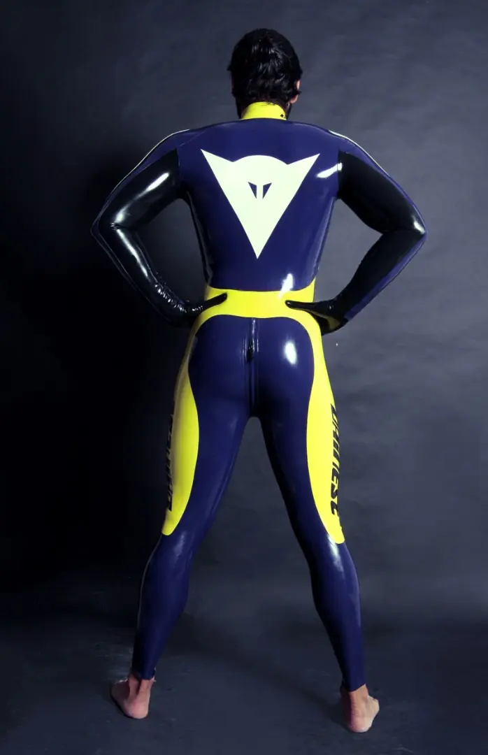 – Latex full catsuit designed similar to a ‘T-Age’ style motoGP biker’s leathers in multiple colors;