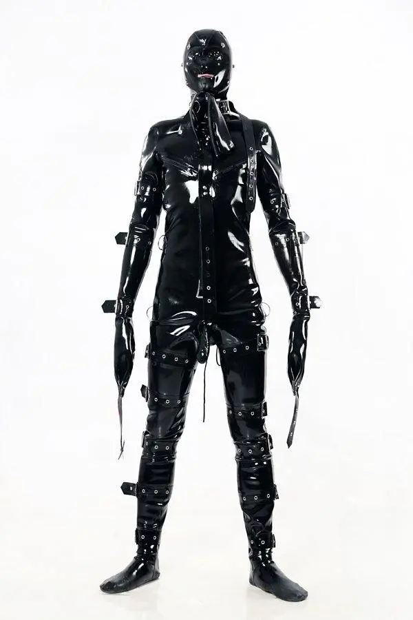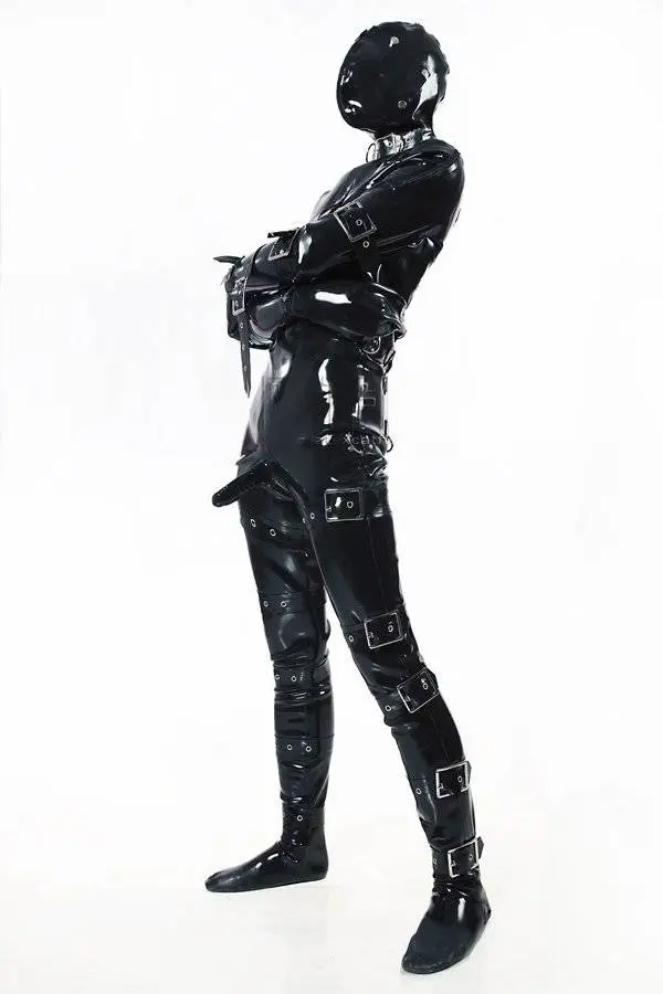 – Full body coverage latex suit with attached hood, gloves and socks as shown;