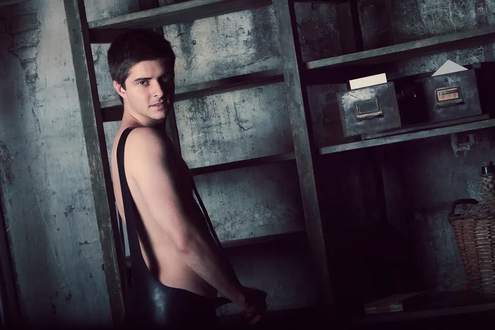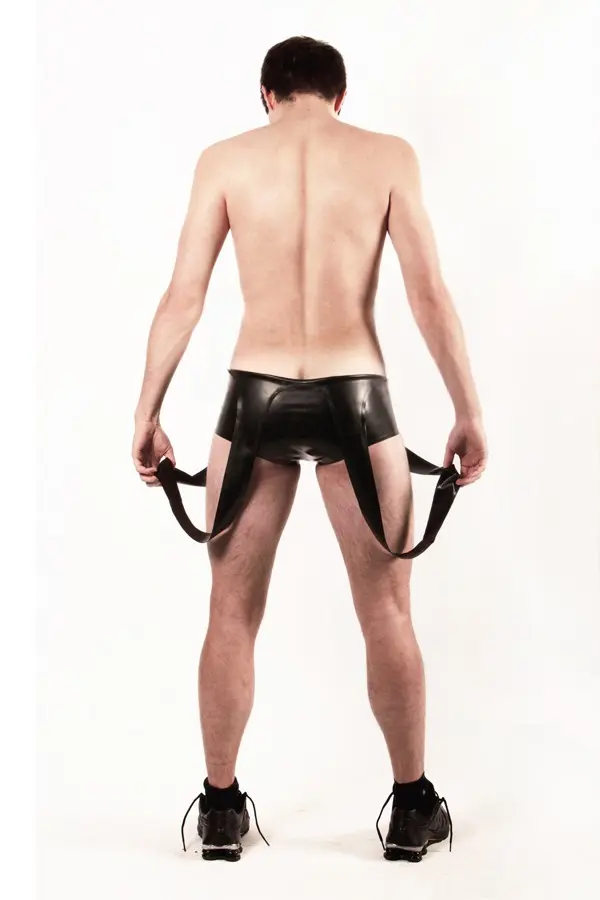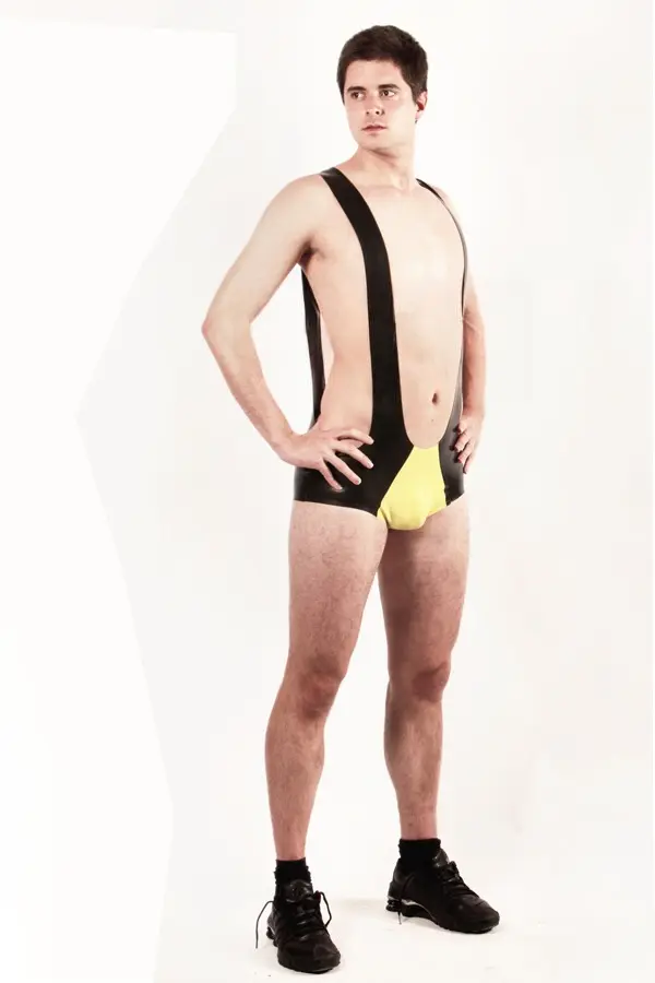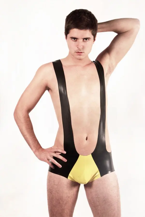 – Wrestling style suit with long shoulder straps and short legs as shown;