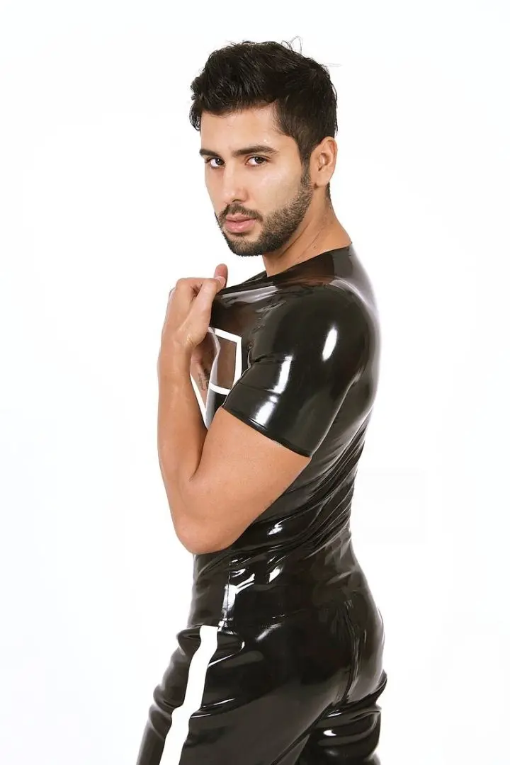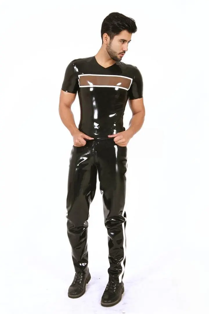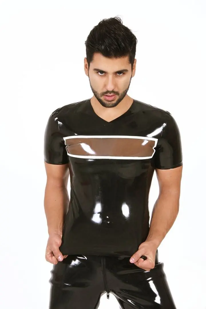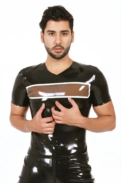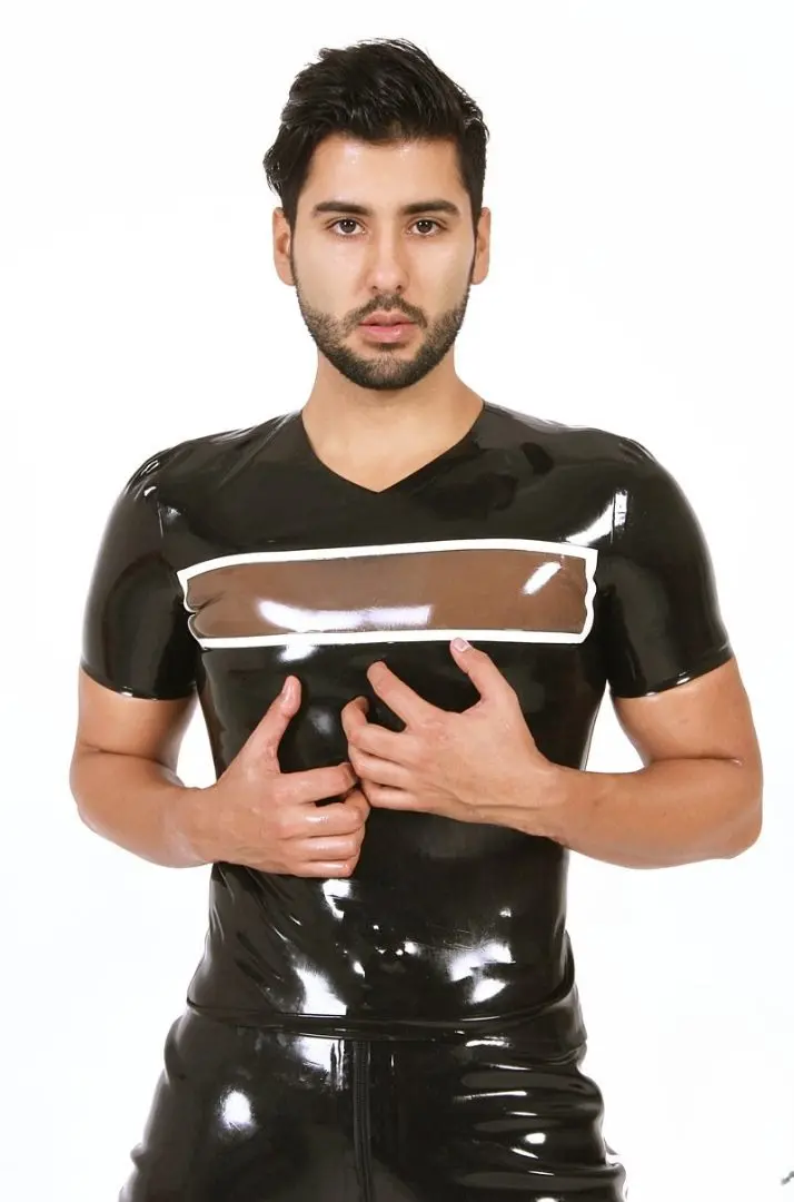 – Latex v-neck t-shirt with short sleeves and contrast color chest panel as shown;