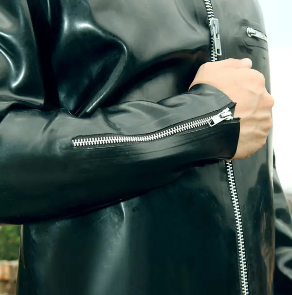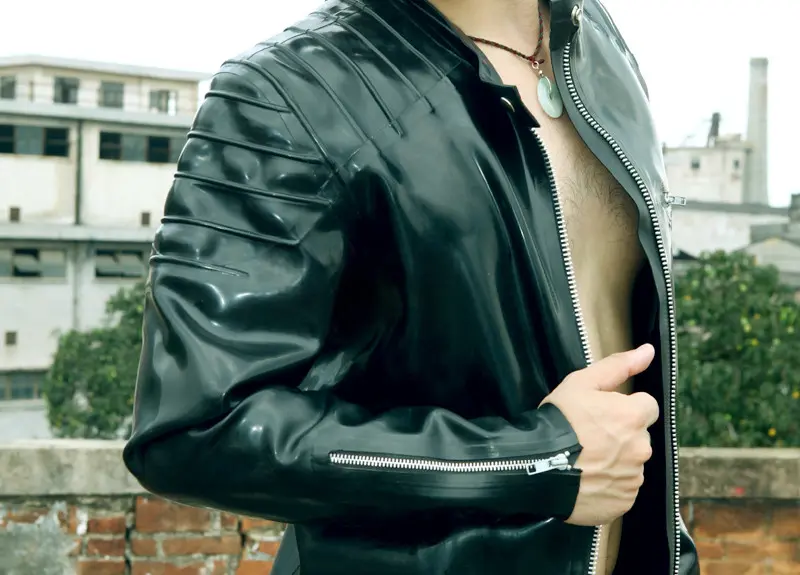 – Men’s latex biker jacket with front metal zipper by default; (other closure options can BE REQUESTED);