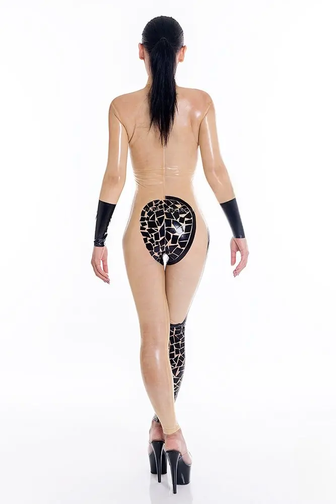 – Tight-fitting catsuit in semi-transparent latex with black detailing as shown;
