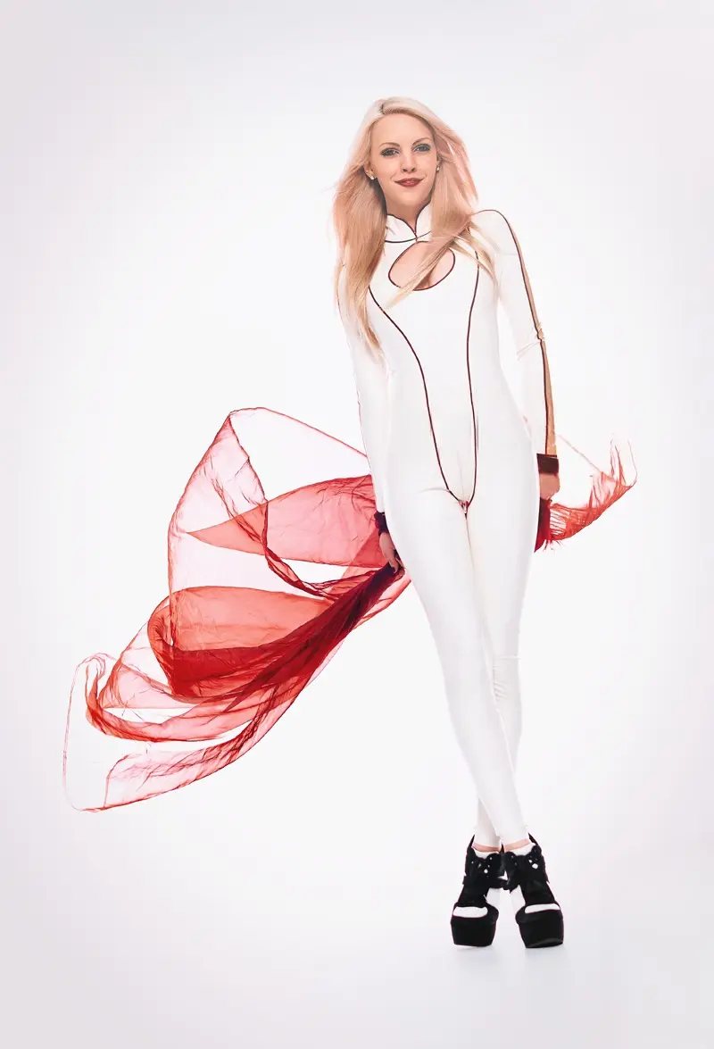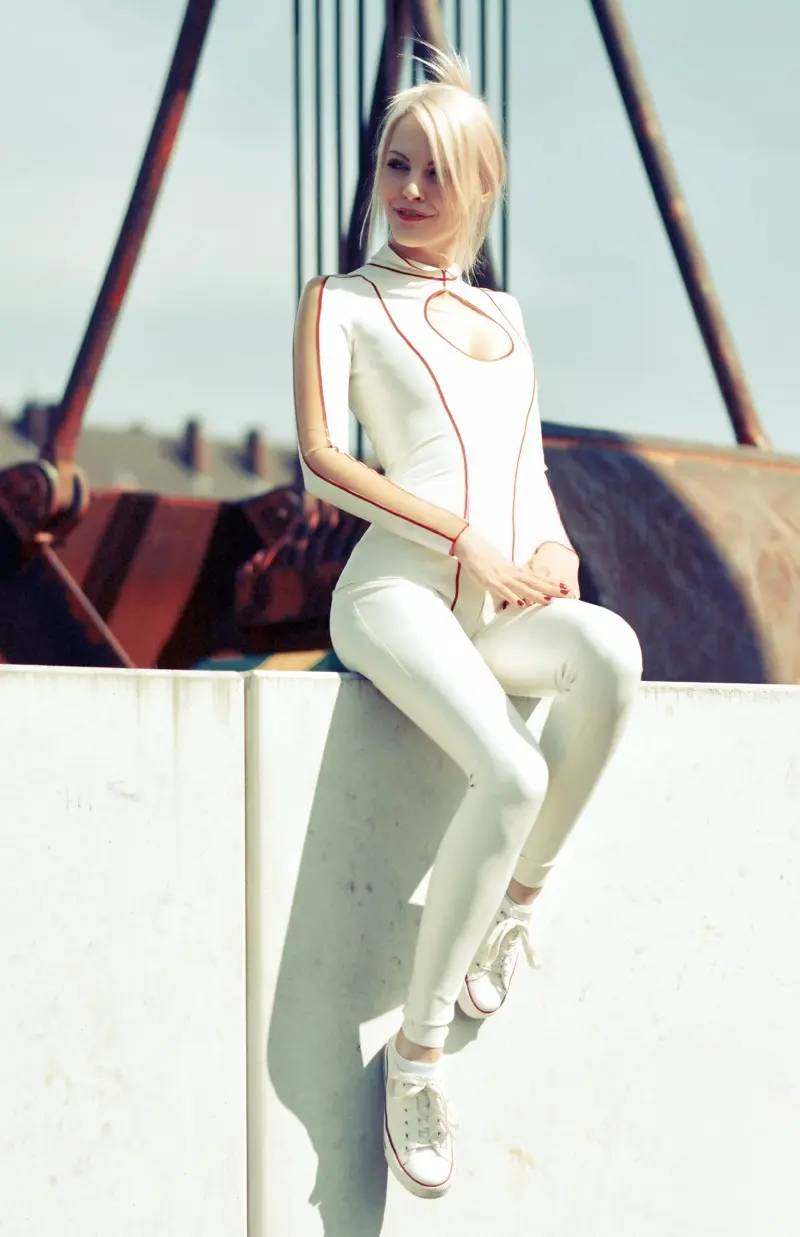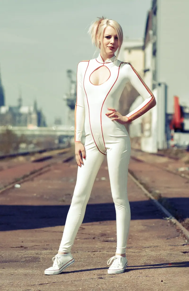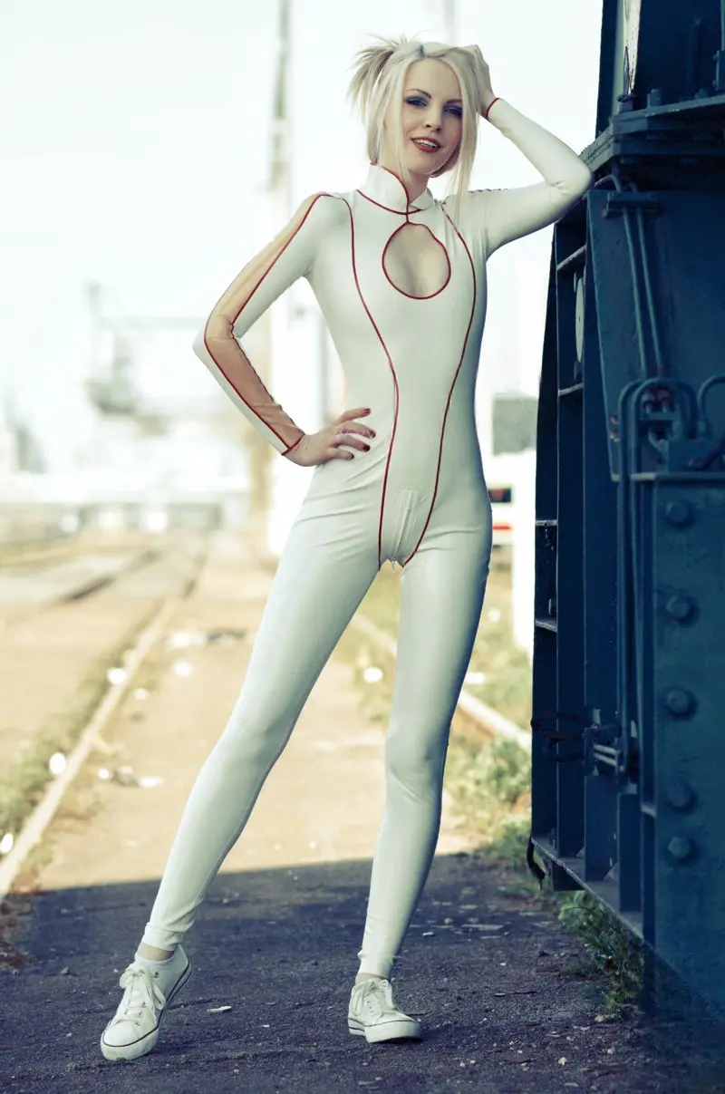 – Long-sleeved latex catsuit with ‘teardrop’ breast opening as shown;