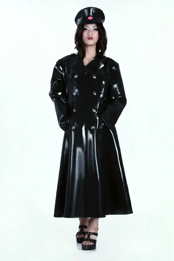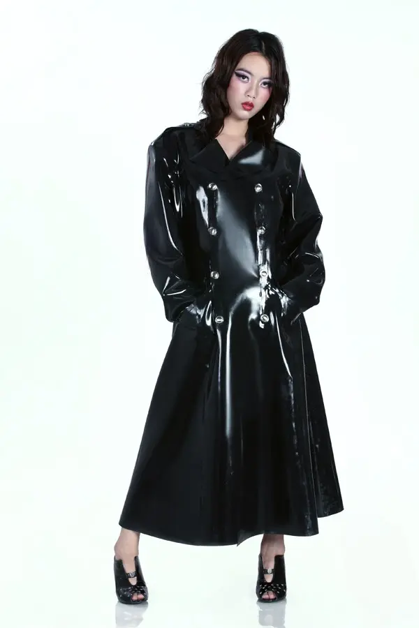 – Long ankle-length loose-fitting double breasted trenchcoat with hood as shown;